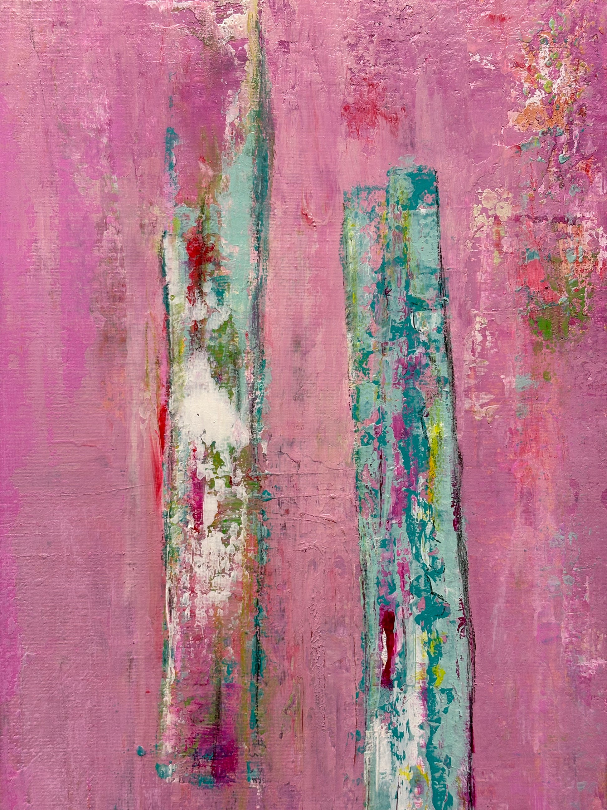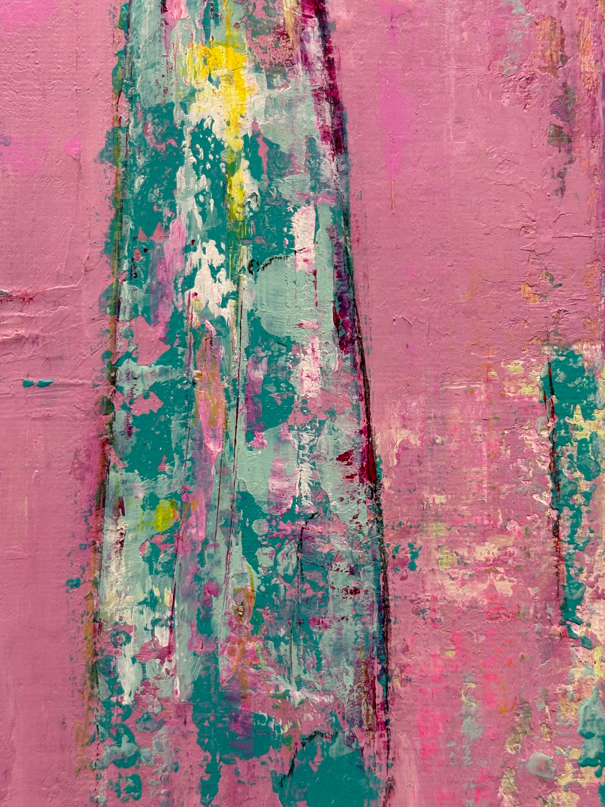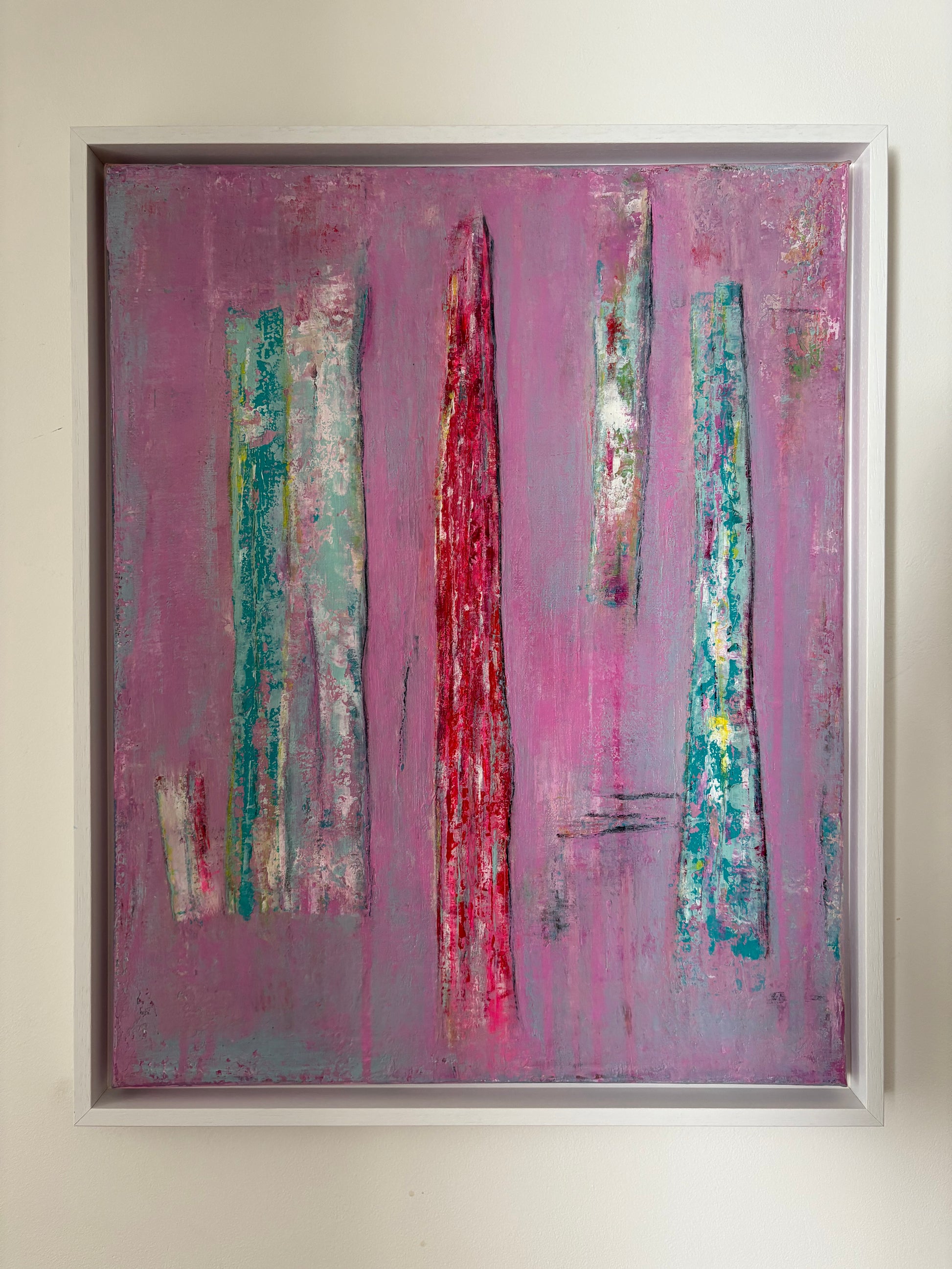 Acrylic, oil pastel and ink on canvas and framed in white wooden float frame.