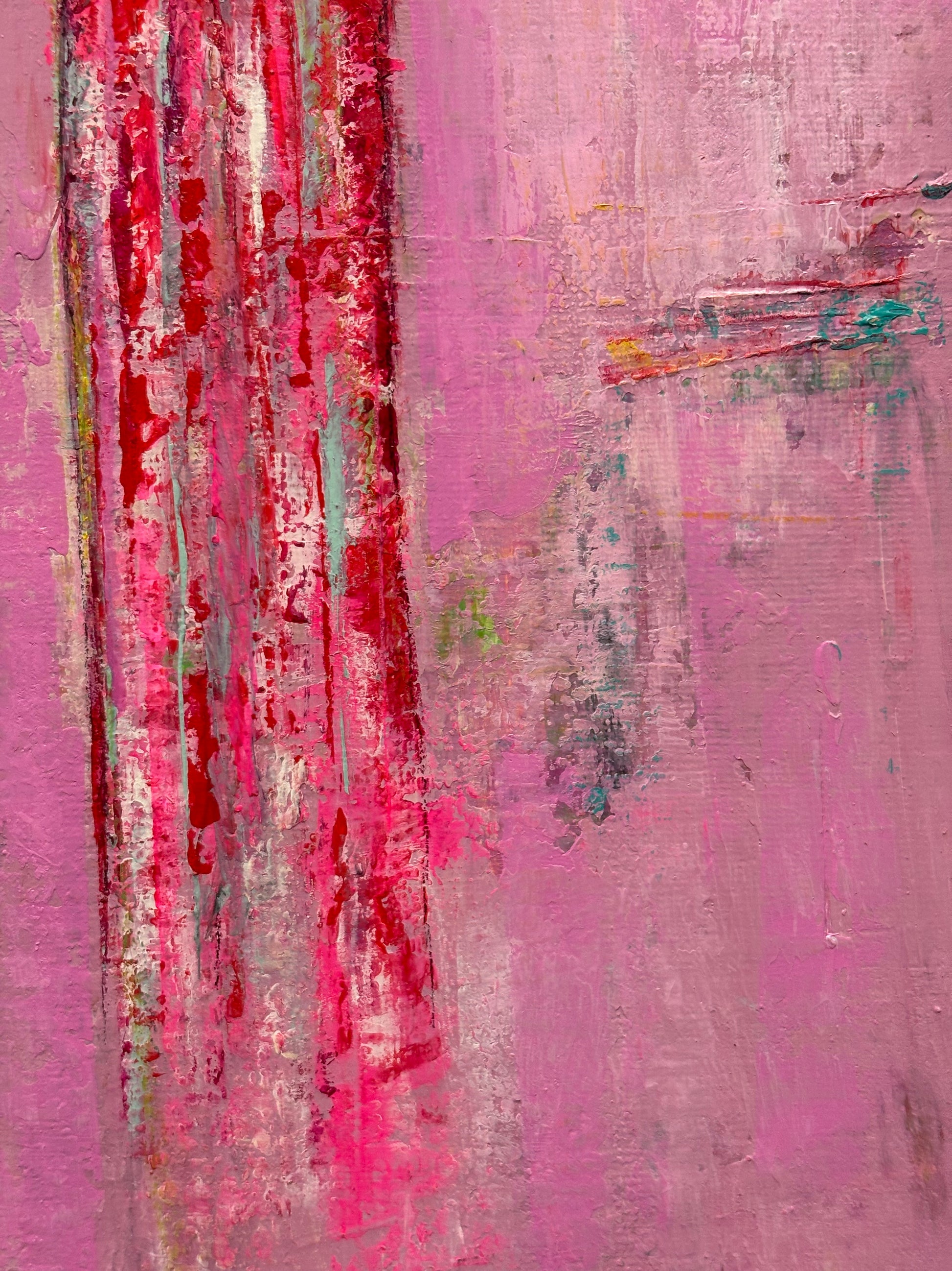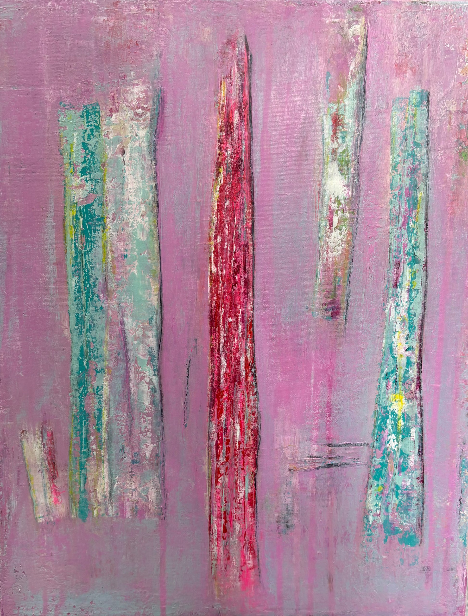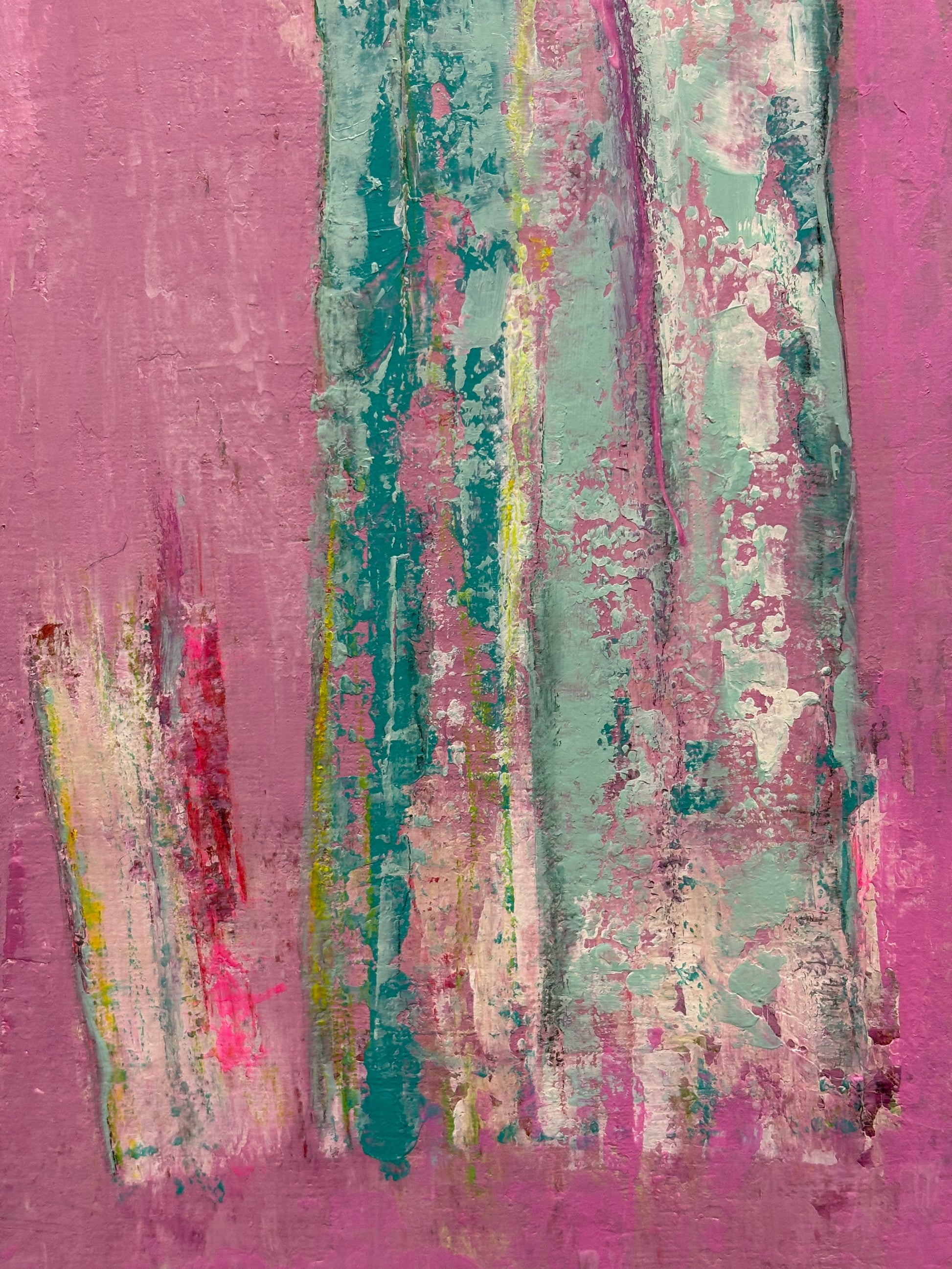 Acrylic, oil pastel and ink on canvas and framed in white wooden float frame.